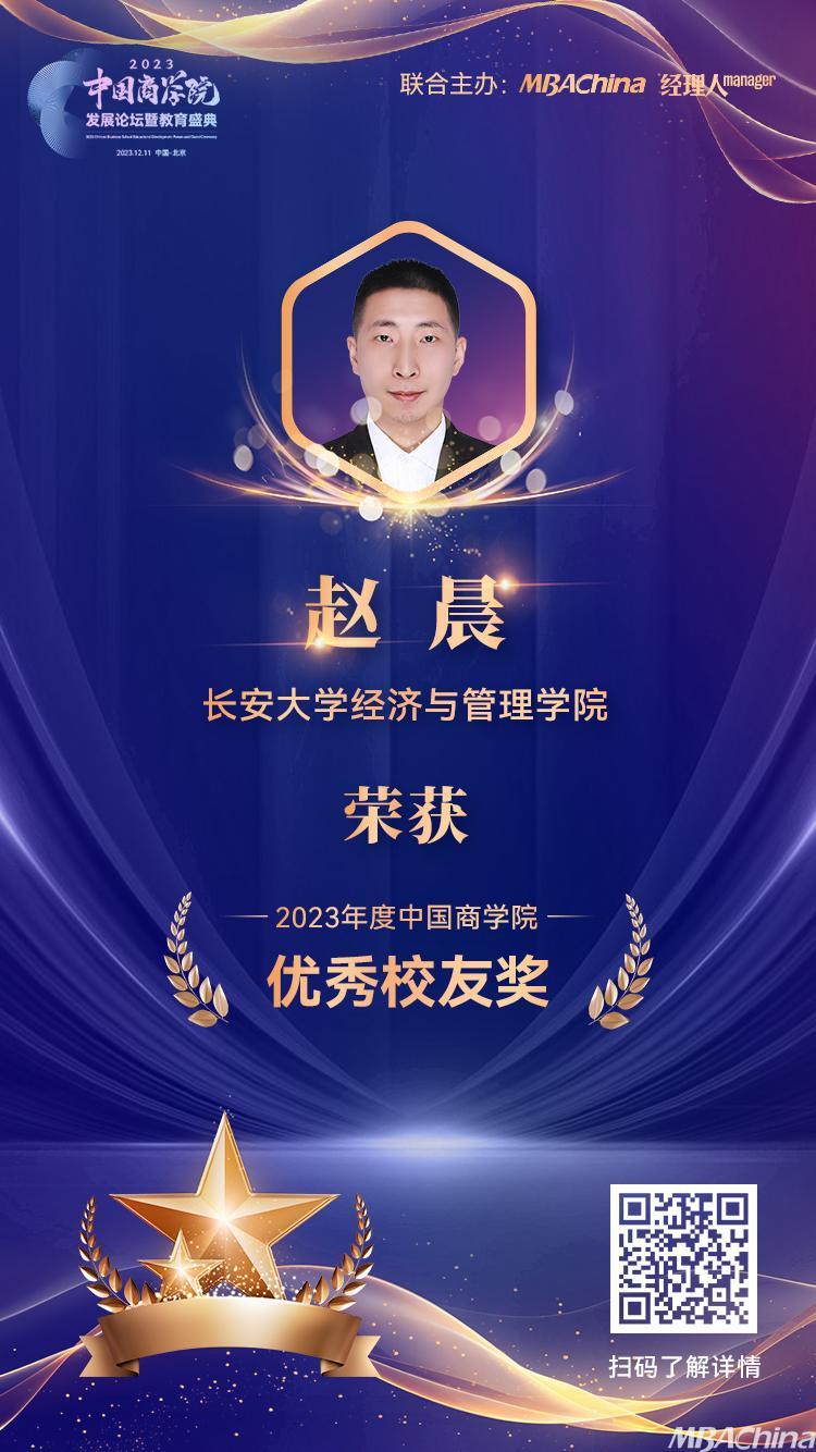 赵晨校友在校期间担任taptap188第二届MBA联合会主席,组织举办多场高质量活动。疫情期间组织联合会及校友会积极支持学校防疫抗疫工作。毕业后扔心系学院发展,协助专业学位教育中心开展相关教学实践活动、校友活动。为此,特为赵晨校友颁发“2023年度中国商学院MBA项目优秀校友奖”。