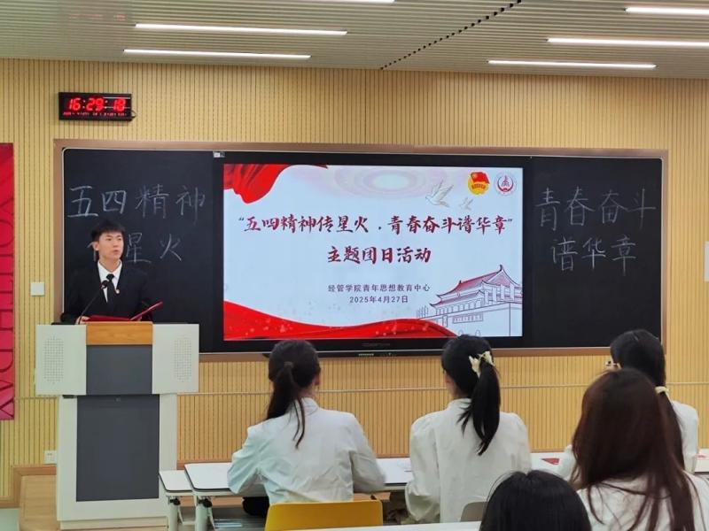 调研开始前,校团委书记丁芝娟一行参加经管学院“五四精神传星火,青春奋斗谱华章”主题团日活动。活动以“半条被子”红色故事开篇,青年讲师深入阐释五四精神时代价值,号召青年学子勇担时代使命。“金句盲盒”环节中,三位学生代表分享金句学习体会,结合实践经历畅谈青春感悟。全体成员共同完成“青春拼图”,在百年青年奋斗史视频展映中圆满结束活动。本次主题团日活动通过沉浸式教育形式,引导青年学子传承红色基因,在推进中国式现代化新征程中贡献青春力量。