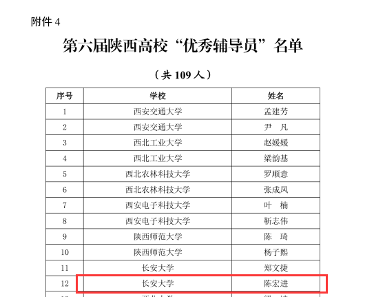 近日,中共陕西省委教育工委、陕西省教育厅发布《关于表彰第六届陕西高校十佳辅导员和优秀辅导员的通报》(陕教工函〔2023〕19号),通报表彰了第六届陕西高校“十佳辅导员”“优秀辅导员”,我院辅导员陈宏进荣获陕西高校“优秀辅导员”荣誉。