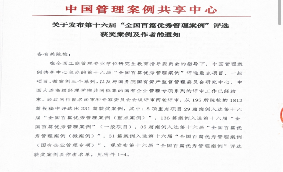 本届“全国百篇优秀管理案例”经过两轮评审,从195所院校的1812篇投稿中评选出231篇获奖案例。其中,7所院校的8个项目29篇案例入选第十六届“全国百篇优秀管理案例(重点案例)”,72所院校的136篇案例入选第十六届“全国百篇优秀管理案例(一般项目)”,26所院校的35篇案例入选第十六届“全国百篇优秀管理案例(微案例)”,24所院校的31篇案例入选第十六届“全国百篇优秀管理案例(国有企业管理专项)”。