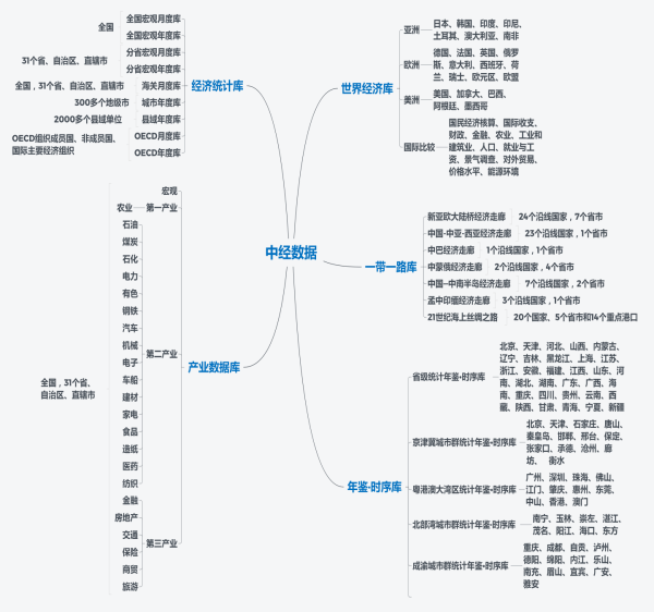 “中经数据”是中经网公司推出的一款涵盖所有宏观经济数据的门户网站,内容囊括了《中经网统计数据库》、《中经网产业数据库》、《世界经济数据库》、《“一带一路”倡议统计数据库》数据库集群及《省级统计年鉴·时序库》、《京津冀城市群年鉴·时序库》、《粤港澳大湾区年鉴·时序库》等热点城市群的统计年鉴·时序库系列产品。按不同主题梳理满足用户不同研究需求,同时支持按关键字跨库检索,提高查询效率。统计知识栏目,提供全面完备的统计制度与统计标准,帮助用户更好地理解指标口径范围与计算方法。