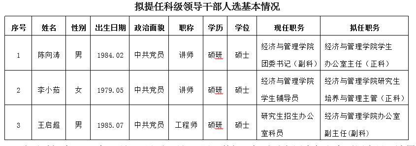 经学院党政联席会议研究并报组织部审核,现按有关规定对以下三人进行任职前公示。