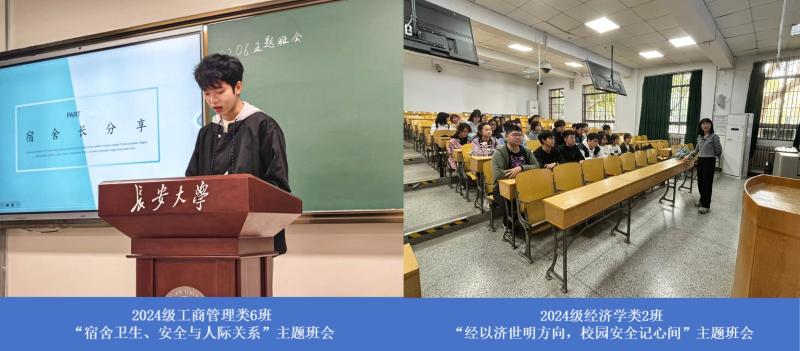 把牢安全守底线,和谐共进谋发展。经济学类二班、工商管理类六班,针对“校园安全与人际关系”召开主题班会。充分强调消防安全、健康安全、财产安全、网络安全等注意事项,号召同学们强化安全防范意识;组织宿舍长对宿舍安全隐患、卫生保持、人际关系等方面进行汇报,以自我反省、互相监督、定期检查的形式,帮助学生养成健康生活习惯,建立良好宿舍关系。