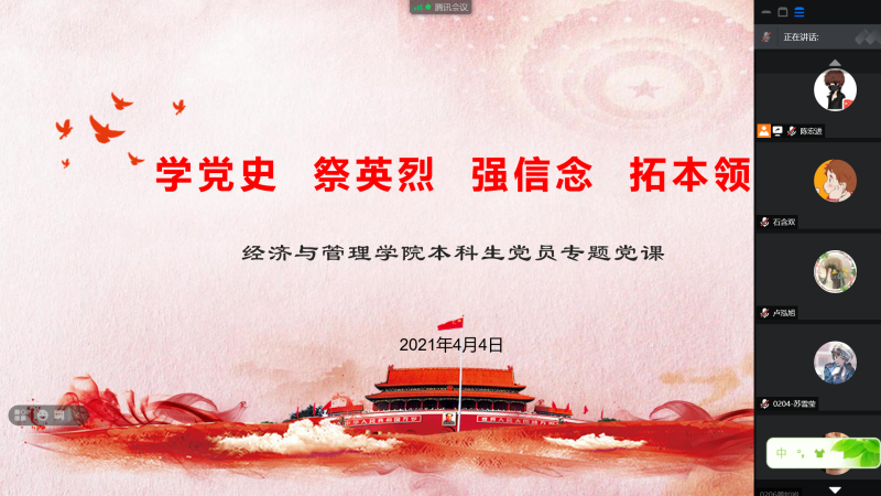 清明期间,经管学院各学生党支部组织党员开展网络祭扫活动和线上主题党课,寄托对烈士的哀思,向革命英烈表达敬意,本科生第一党支部书记陈宏进以“学党史、祭英烈、强信念、拓本领”为主题带领学生党员进行了专题学习。