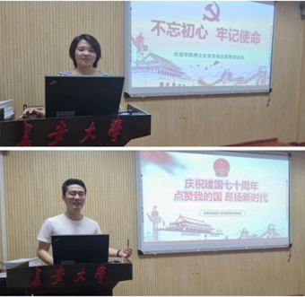 之后,党员代表李毅、白鹏霞等同志作“我和我的国”主题演讲,纷纷指出我们作为从峥嵘岁月到艰苦奋斗到改革开放再到走进新时代,幸福生活来之不易,没有共产党就没有新中国。学生党员要紧密团结在以习近平同志为核心的党中央周围,把爱国情、报国志融入伟大祖国建设和日常学习生活与工作之中,不忘初心、牢记使命,向中华人民共和国成立70周年献礼、致敬。