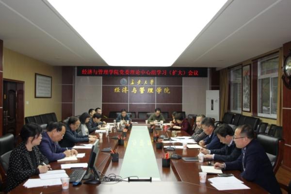 2019年4月15日下午,经管学院党委组织召开理论学习中心组学习(扩大)会议,研究部署进一步贯彻落实工作。院领导班子成员、党委委员、工会主席、支部书记等参加了会议,会议由党委书记魏一虎主持。