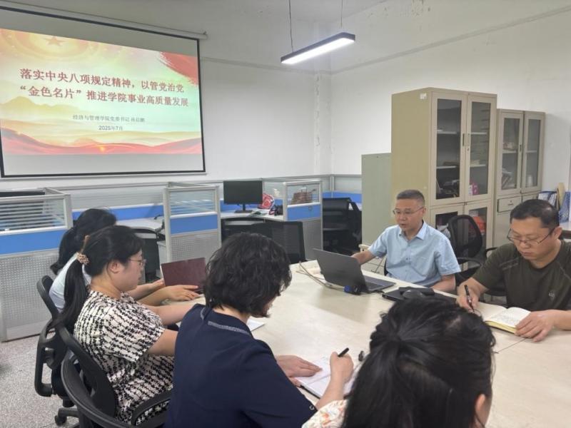 2025年7月10日,会计系党支部开展深入贯彻中央八项规定精神学习教育专题党课活动。学院党委书记孙启鹏以“落实中央八项规定精神,以管党治党‘金色名片’推进学院事业高质量发展”为主题,为会计系全体党员讲授了一堂深刻而生动的党课。